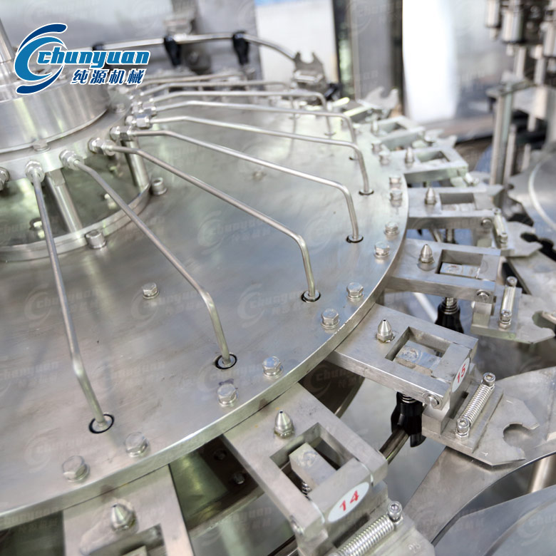 瓶子由通過風送道傳遞,然後通過撥瓶星輪傳送至三合一機的衝瓶機。衝瓶機回轉盤上裝有瓶夾,瓶夾夾住瓶口沿一導軌翻轉180°,使瓶口向下。在衝瓶機特定區域,衝瓶夾噴嘴噴出衝瓶水,對瓶子內壁進行衝洗。瓶子經衝洗、瀝幹後在瓶夾夾持下沿導軌再翻轉180°,使瓶口向上。