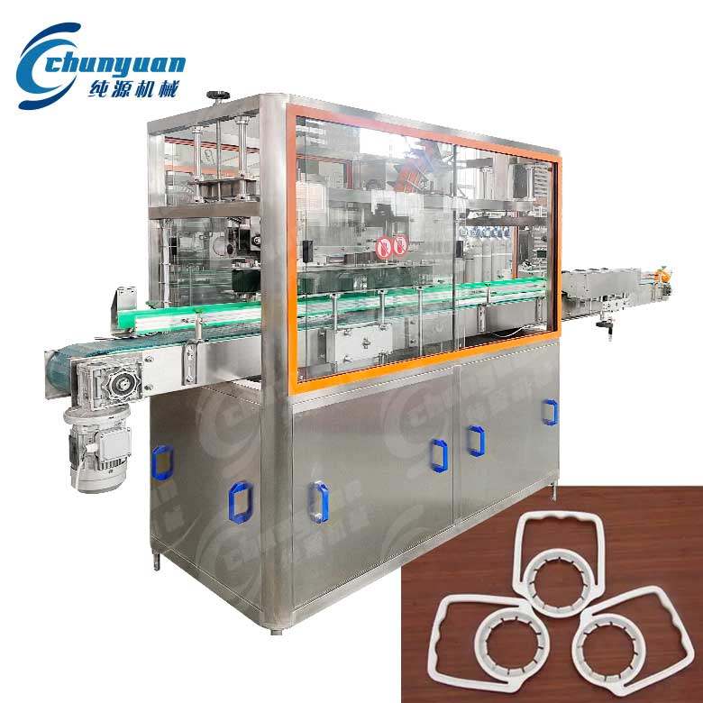 工藝流程:提手環自動上料―手提環儲存槽-手提環環分離―手提環滑入狹槽――手提環套在瓶口上―手提環壓入完成並傳送到下一生產環節。